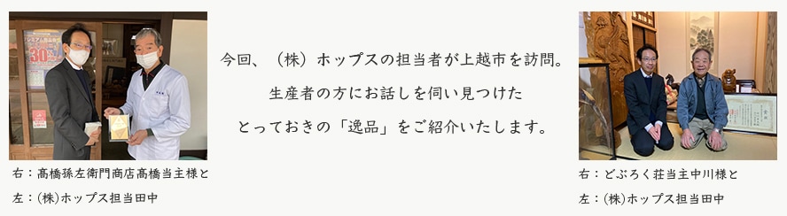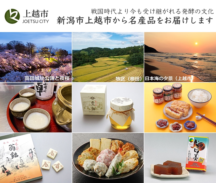 「メイド・イン上越」とは、上越市がブランド認証する優れた特産品・工業製品です。年に1度、外部の専門家による信頼性や市場性などの厳しい審査をクリアした商品のみがメイド・イン上越としてみとめられ、現在124商品(特産品91商品、工業製品33製品)が認証されています。今回は、この特産品を中心に厳選したラインナップをご紹介させていただきます。