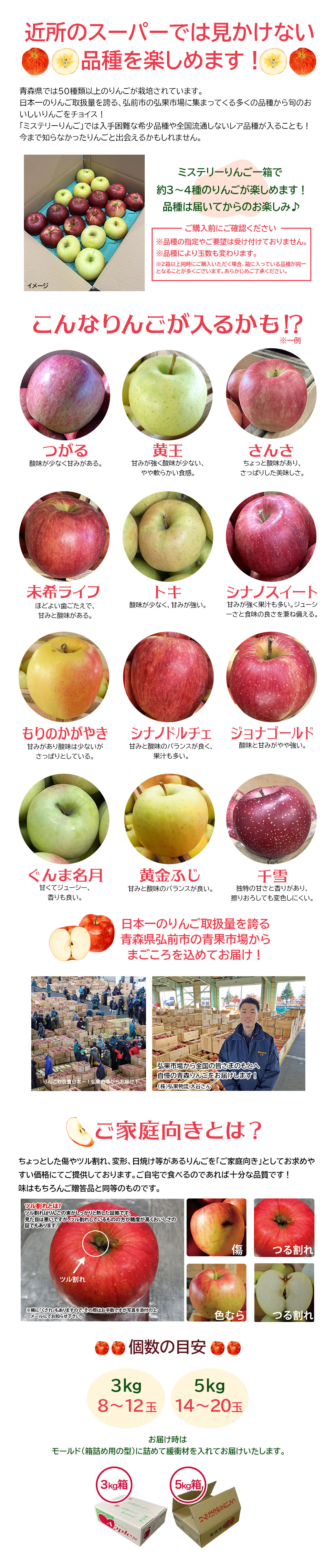 青森県から直送!『ミステリーりんご』(その時に「旬の品種」をお届け!どの品種が入っているかは届いてからのお楽しみ!)(届いた品種がすぐに分かるご案内シートを同梱!)【ご家庭向き:約3kg、約5kg】おまとめ買いがお得!(4箱までなら何箱買っても送料一律1,200円!※ただしお届け場所は同一1か所、同一kgの箱に限ります)