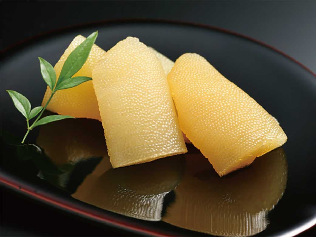 数の子の醍醐味はコリコリプチプチした食感、そして噛み締めると口に広がる旨味です。この食感を楽しんでいただけるよう、太平洋産の良質な数の子を使用し、上品な薄味に仕上げました。黄金色に輝く色彩はおせちの華。いつまでも噛み続けたくなる程、美味しい一品です。