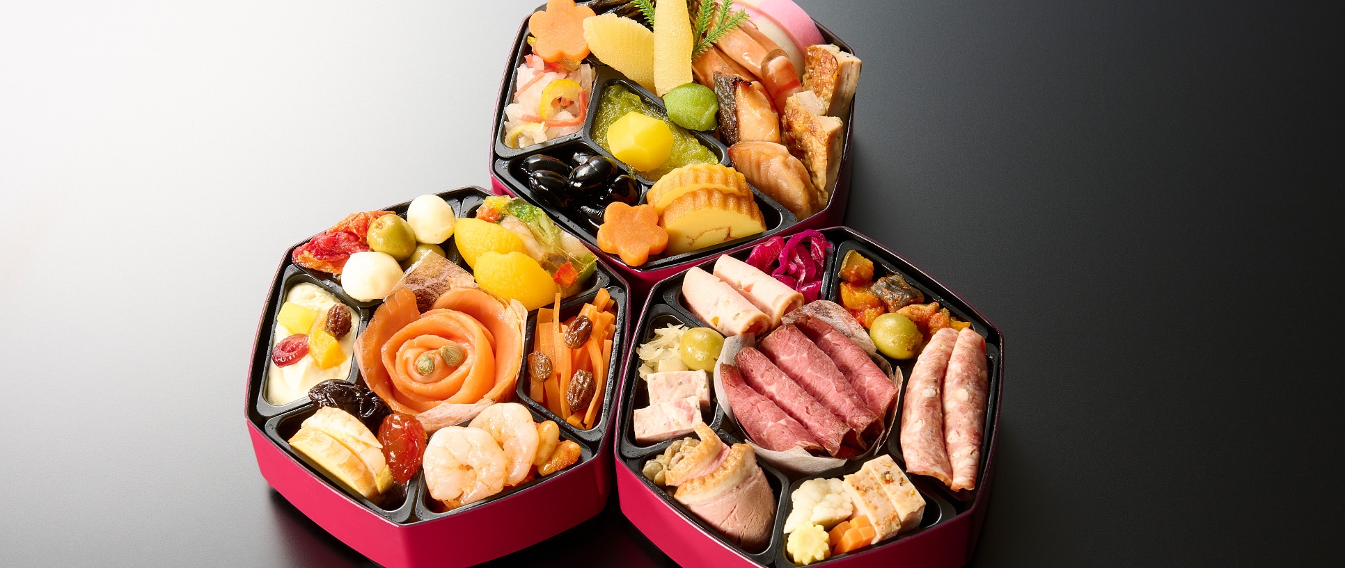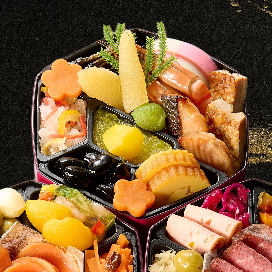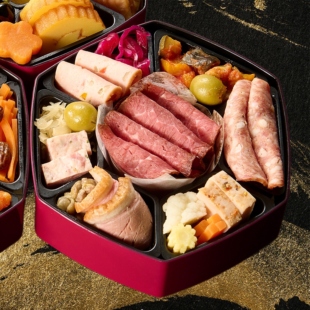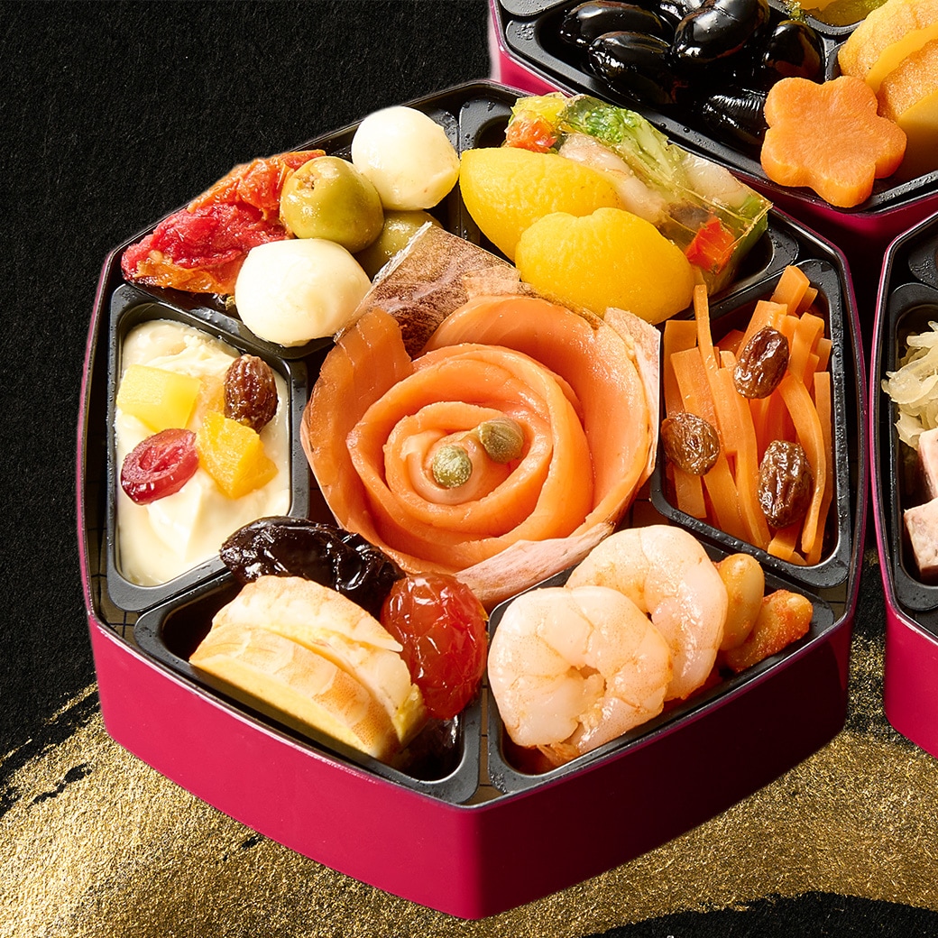 銀座花蝶総料理長監修、和洋折衷の創作おせち。和の伝統的なおせち料理にフレンチやイタリアンの技法を取り入れた、お二人様用のおせちです。