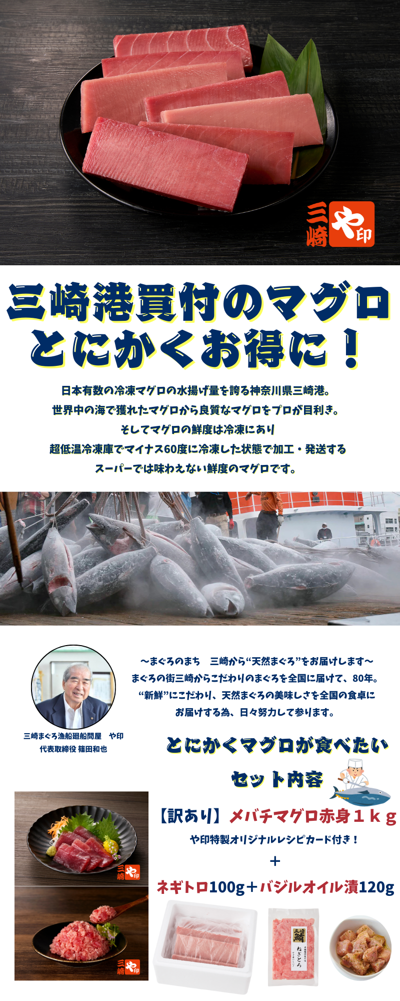 「三崎まぐろ」とは、全国トップクラスのまぐろの水揚げ高を誇り、神奈川県三浦半島先端に位置する三崎漁港で取り扱われるまぐろの愛称です。「まぐろと言えば三崎、三崎と言えばまぐろ」と言われるほど、鮮度保持力抜群、刺身、寿司ネタ、丼ぶりなどに最高です!